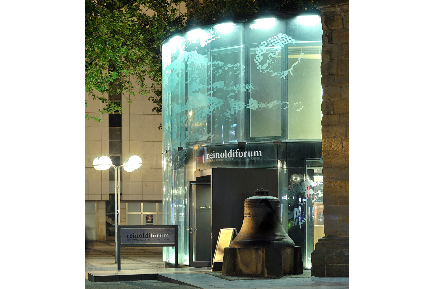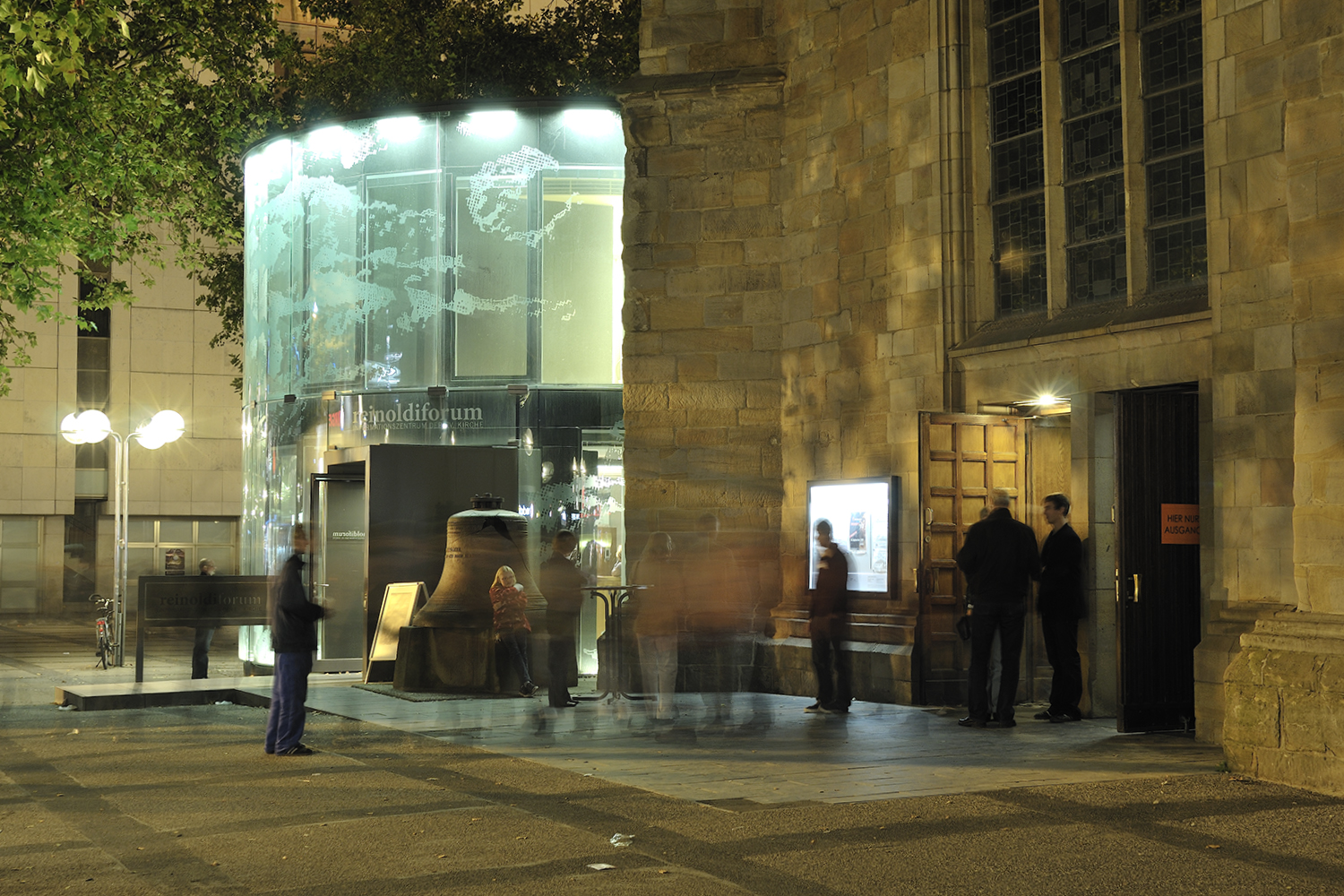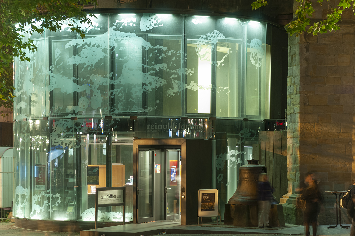 Anbau an die historische Reinoldikirche - Verbindendes Element zwischen Historie und Moderne ist der Glockenturm, Lückenschluss durch die 2 m dicke, massive Außenwand, eine doppelschalige, radiale, gebogene und rahmenlose Glasfassade.
