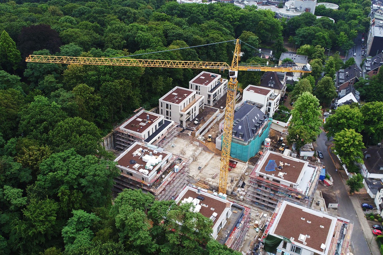 8 MFH, 3 TG mit 104 STP, 33 WE im hochwertigen Wohnungsbau, 120 m Hangsicherung durch aufgelöste Bohrpfahlwand, Sanierung der denkmalgeschützten Villa Henle
